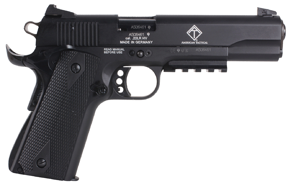GSG GSG1911ADOP M1911 ADOP 22 LR 10+1 5″ Black Steel/Threaded Barrel & Serrated Slide, Zinc Alloy w/Accessory Rail & Beavertail Frame Black Double Diamond Polymer Grip