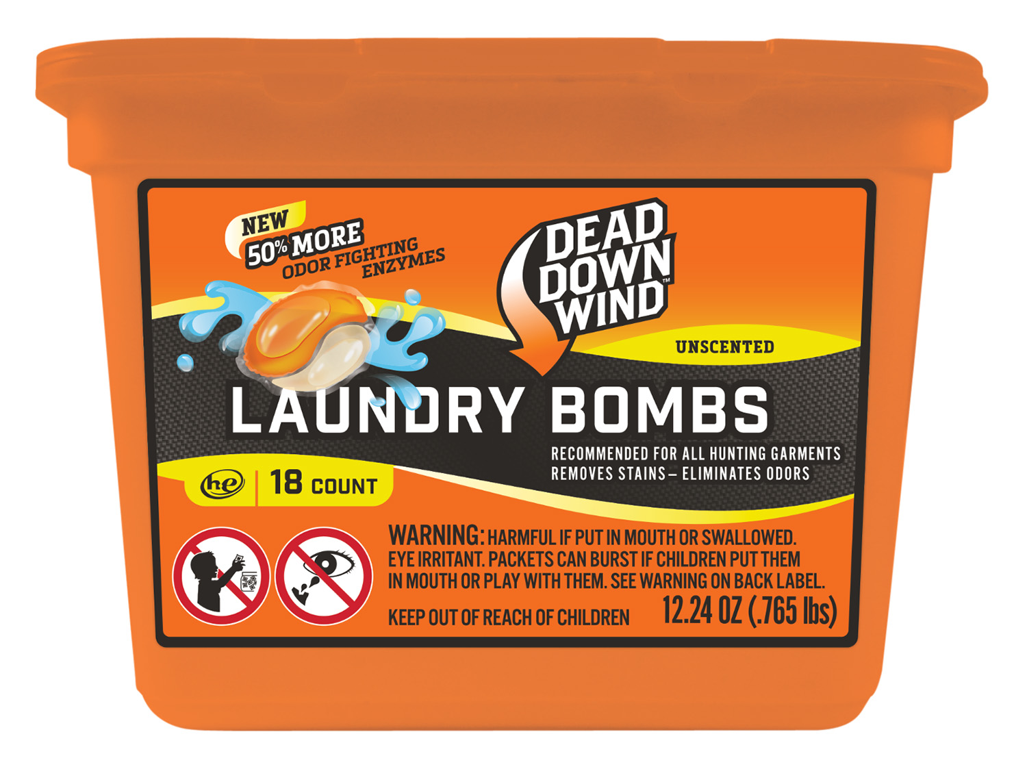 Laundry Bombs are new easy-to-use, water soluble multi-chamber packs that consist of Dead Down Winds proven enzyme-based detergent, now with 50% more enzymes. Place a Dead Down Wind Laundry Bomb into the washing machine drum before adding hunting garments to remove stains, odors and even increase the longevity of your gear. Laundry Bombs are effective on natural, technical, synthetic or carbon garments to remain undetected when you step foot into the woods this season.