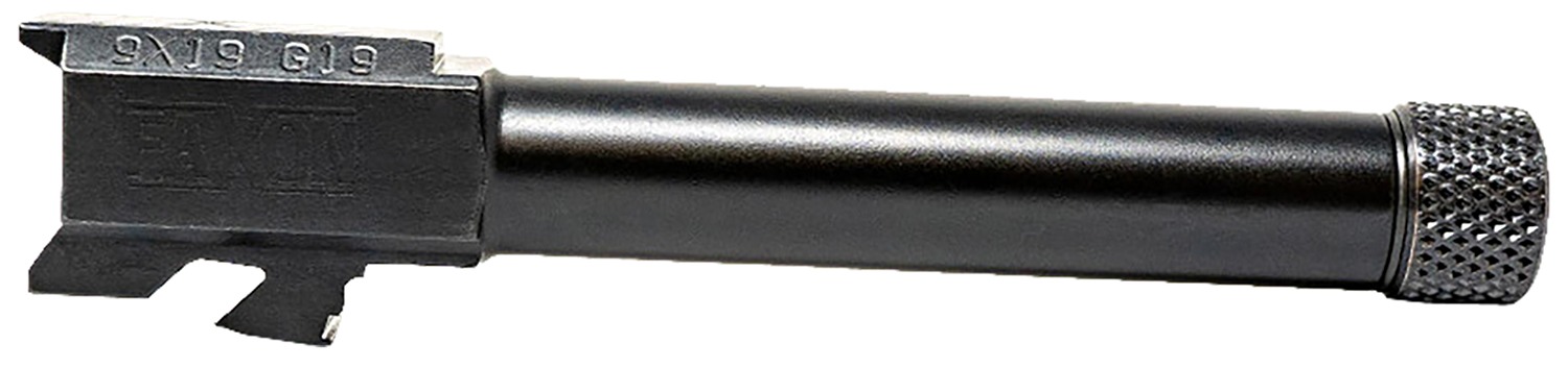 Faxon’s Duty Series Pistol Barrels for G19/Glock 19 are machined from stress-relieved 4150 CMV steel. The barrels are given a black Nitride coating to increase lubricity, barrel life and resistance to surface wear. All barrels are conventionally rifled to allow a wider range of ammunition to be used, including cast lead. The barrels drop into factory-spec slides with no gunsmithing required. Better-than-factory tolerances ensure a consistent, tighter lockup than OEM. Features button rifling, fully stress relieved; Salt Bath Nitride inside and outside finish; 1/2″-28 thread and 11 degree target crowned.