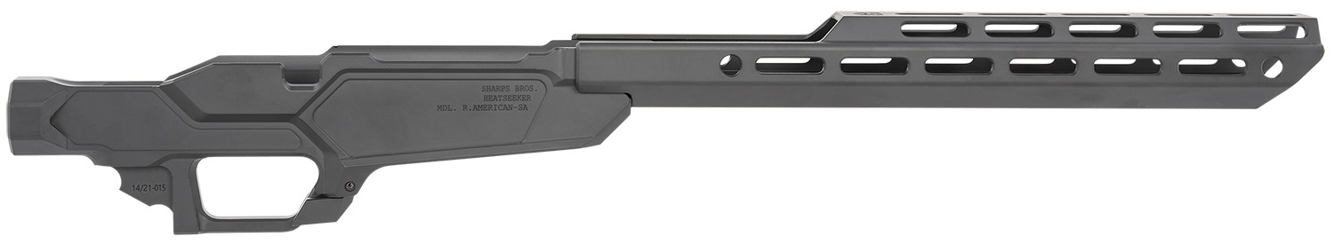 The Sharps Heatseeker is an innovative, affordable chassis system for your bolt action rifle, allowing you to easily upgrade a traditional factory rifle stock for improved versatility and a sleek, modern appearance. This sub 2 lb chassis is machined from billet high-strength 6061-T6 aluminum and includes a 10 ounce, 14″ handguard cut from a unique extrusion shape exclusive to Sharps Bros. Both the chassis body and the handguard are finished in a matte black Cerakote. The handguard features M-LOK slots on 4 sides for various attachment options and two quick disconnect fittings per side for sling attachment. Add your pistol grip and stock of choice with the Heatseeker’s standard AR-15 grip and AR buffer interface. With Heatseeker you can easily and affordably convert your bolt action rifle into an enhanced magazine fed system. Heatseeker’s sleek contemporary design will completely transform the look of your rifle, with no need to visit a gunsmith: simplified instructions and functionality make installation a breeze. Heatseeker is compatible with AICS short action magazines from Magpul and Accuracy International.