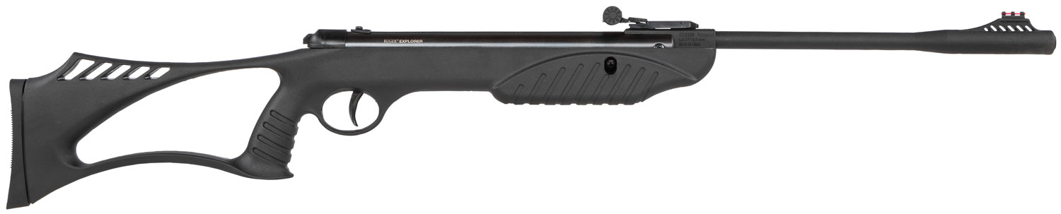 The Ruger Explorer youth air rifle is a spring piston single-stroke break barrel air rifle with an all-weather composite black stock. This Ruger Air Rifle’s stock is ambidextrous and has a thumbhole stock and vented cheekpiece for comfort and ease of use. The Explorer rifle shoots pellets out of its rifled barrel at 495 fps. Accuracy is a breeze with its fiber optic sights. The Explorer also comes with an automatic safety and rubber recoil pad. It is designed as a youth rifle with a shorter overall length, lighter frame, and an added anti-slam trigger-barrel safety system.